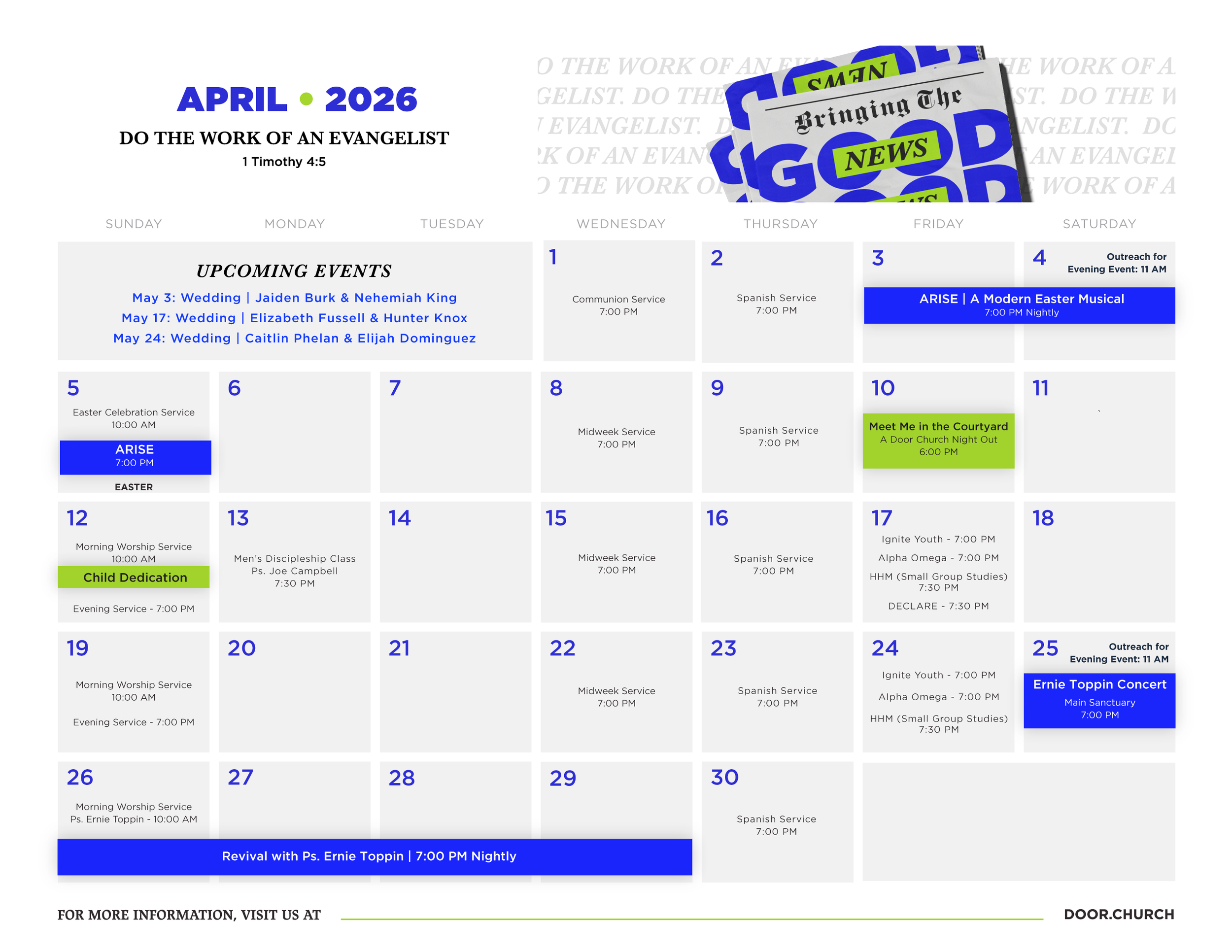 Let us join together as a church for an outreach to invite those in our community this Saturday, April 4, meeting at 11 AM in the lobby. Take some time to Invite friends, family, and coworkers to experience a live musical version of Jesus’ life and ministry on stage. You can grab invitations in the lobby or share digital invites at door.church/events.