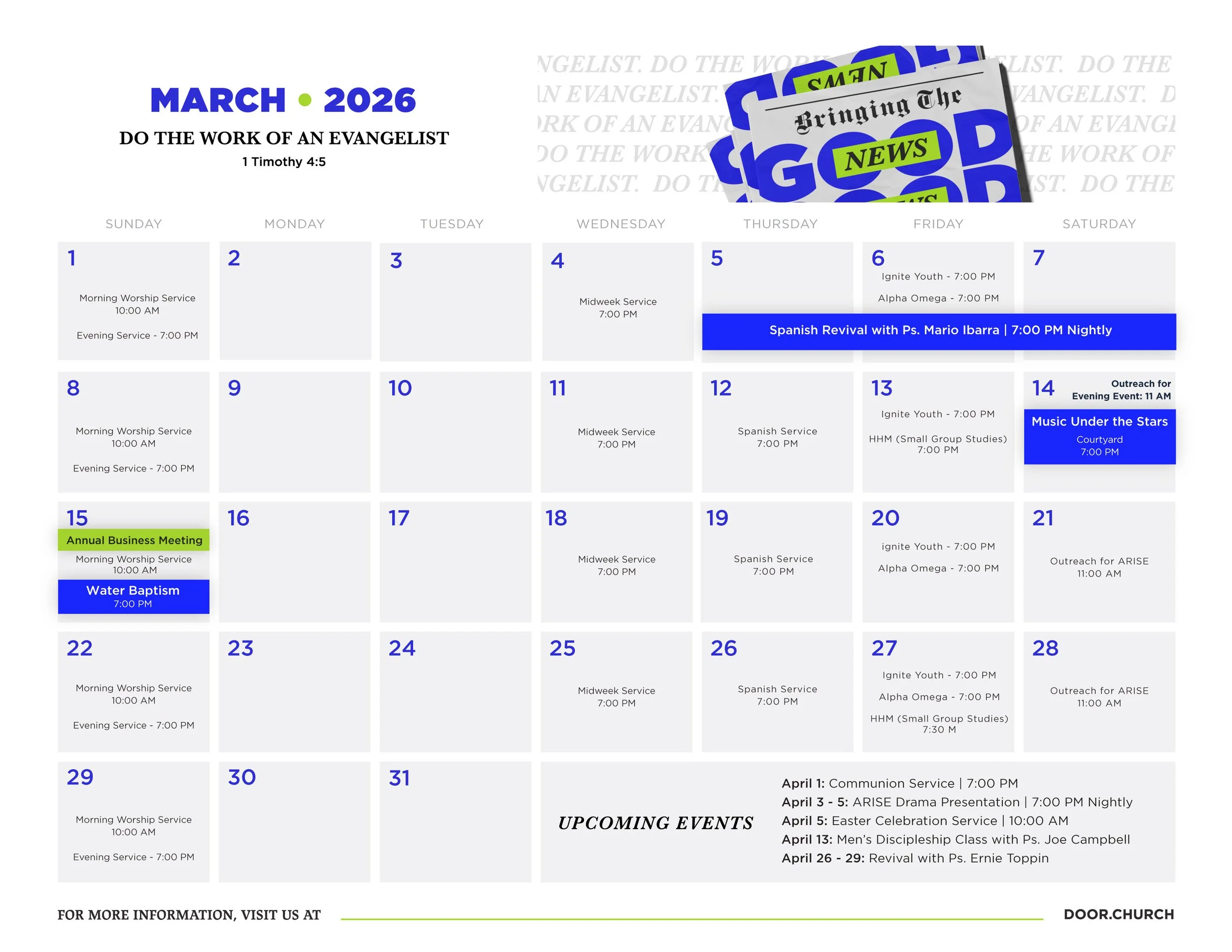 This Thursday through Saturday, March 5 – 7 at 7 PM, there will be revival services in our Spanish ministry congregation with Ps. Mario Ibarra. In-person English translation will be available, and livestream of the services will be on our Door Church Espanol YouTube channel.